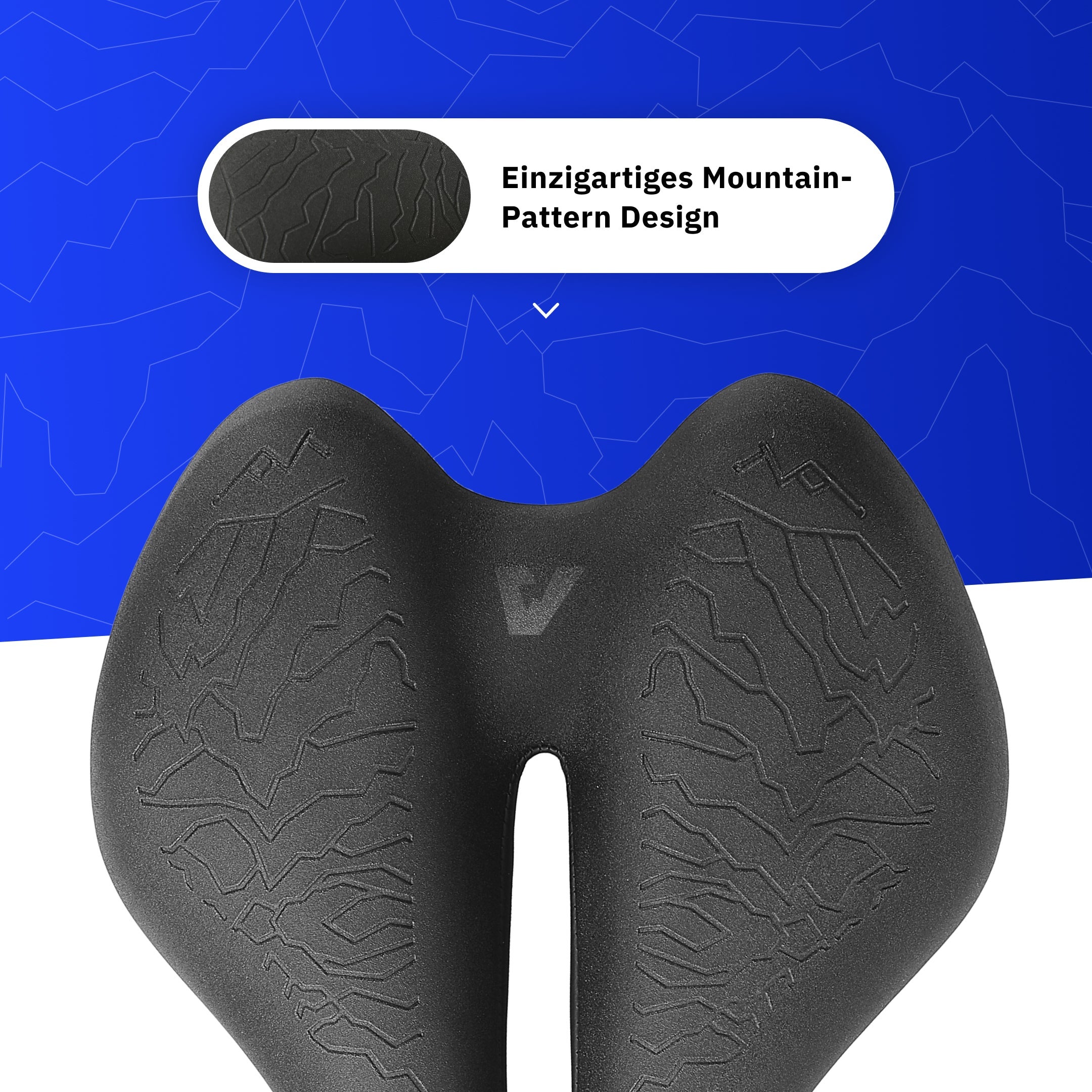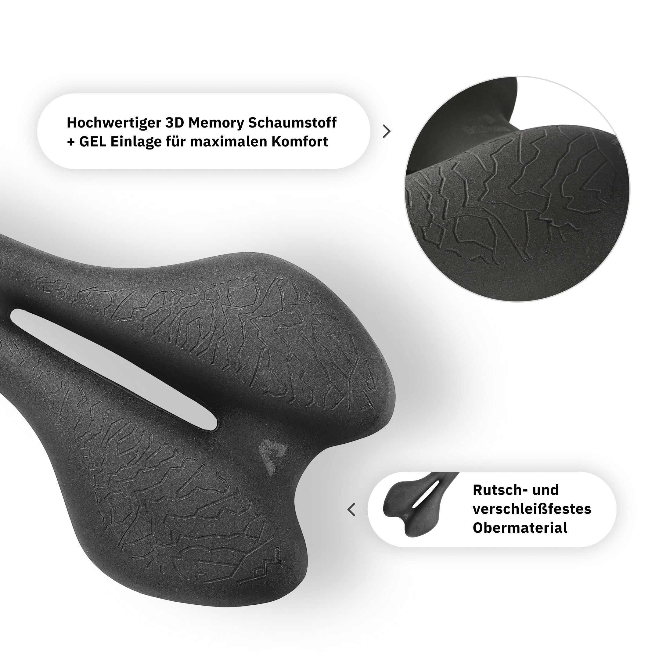 Viele Sattel sind zu weich, andere hingegen zu hart, unser 3D Memory Foam+ ist die goldene Mitte. Bei zu weichem Material versinken die Sitzknochen und sind noch mehr gereizt als bei einem harten Sattel. Das 3D Memory Foam+ passt sich deinem Gesäß an, aber lässt deine Sitzknochen nicht absinken, sondern verteilt den Druck gleichmäßig. Die Aussparung entlastet den Dammbereich und die Genitalien, dadurch sind Taubheitsgefühle Geschichte.